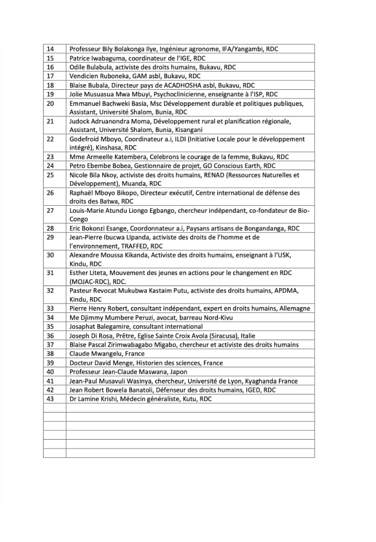 Parmi ces libres penseurs, on retrouve Denis Mukwege, Bob Kabamba, Jean-Claude Katende, Jean-Claude Mputu, ainsi que d’autres défenseurs des droits de l’homme et de l’environnement, qui adressent une lettre ouverte à Félix-Antoine Tshisekedi.