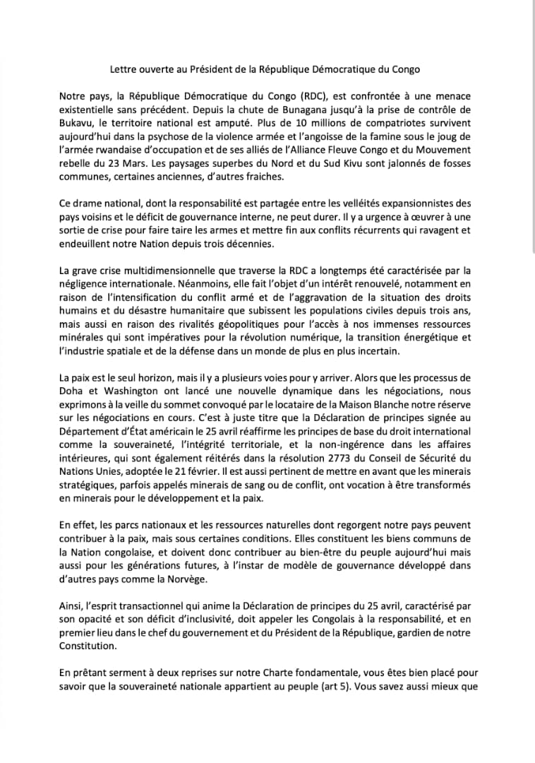 Les signataires invitent le Chef de l’État « à ne pas sacrifier les minerais congolais, à inclure la justice transitionnelle dans tous les efforts déployés pour restaurer et consolider la paix, à faciliter des consultations nationales impliquant toutes les forces vives de la Nation, y compris les élus de l’Assemblée nationale, avant de vous engager au nom du peuple congolais, et à défendre exclusivement les intérêts du peuple congolais souverain lors de votre prochain séjour à Washington ».
