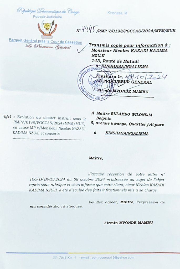 « J’accuse réception de votre lettre numéro 166/D/BWD/2024 du 08 octobre 2024 m’adressée au sujet de l’objet repris sous rubrique et vous informe que votre client, sieur Nicolas Kazadi Kadima Nzuji, a été disculpé des faits infractionnels mis à sa charge. »